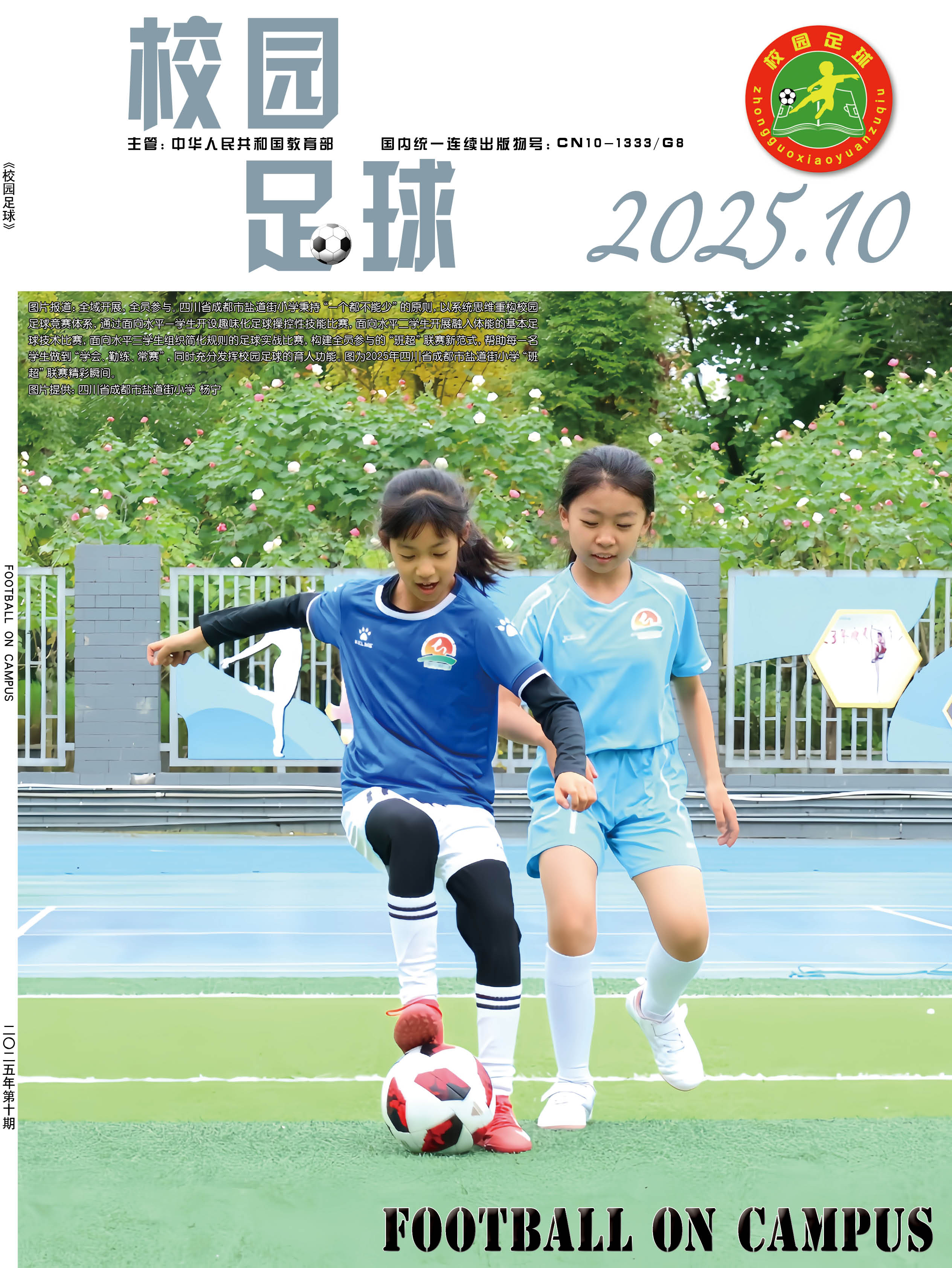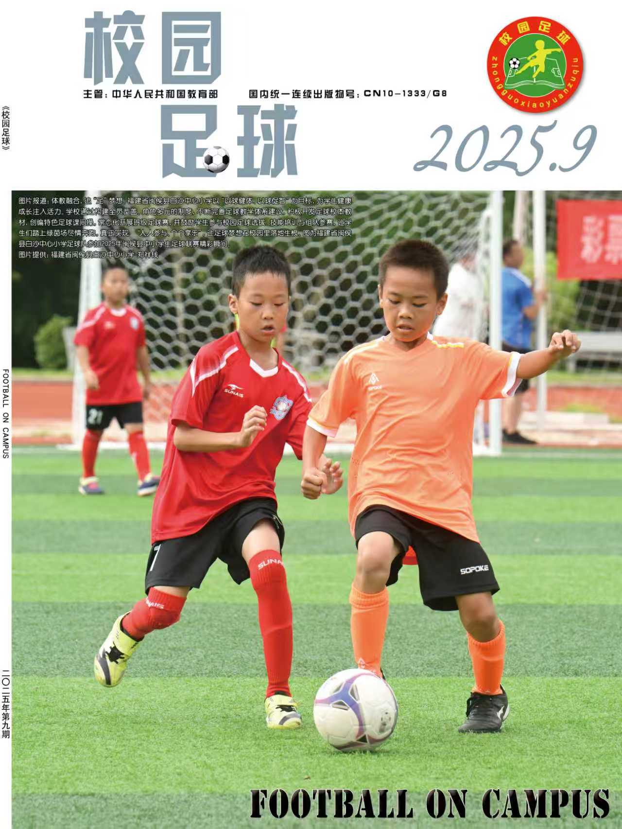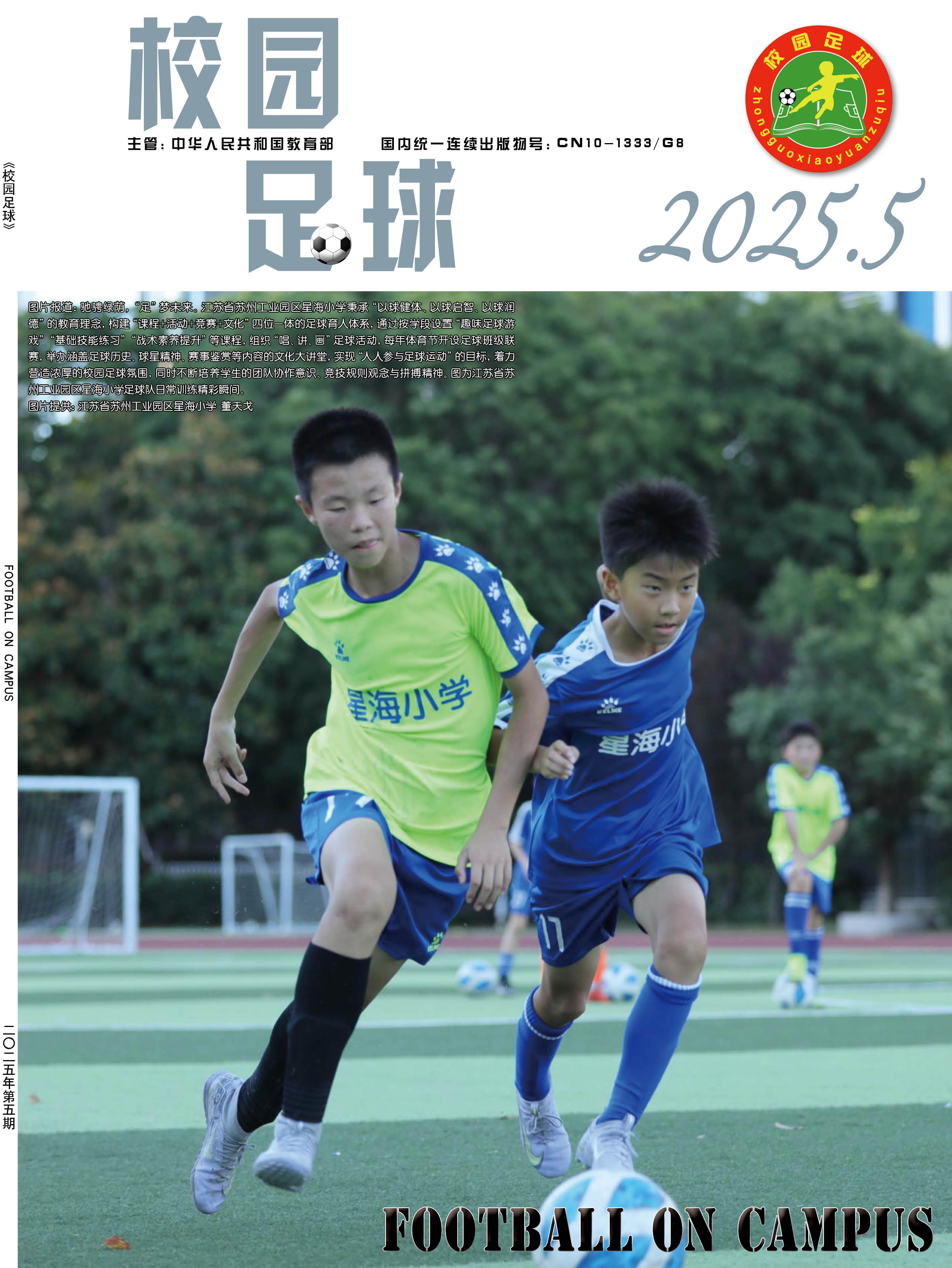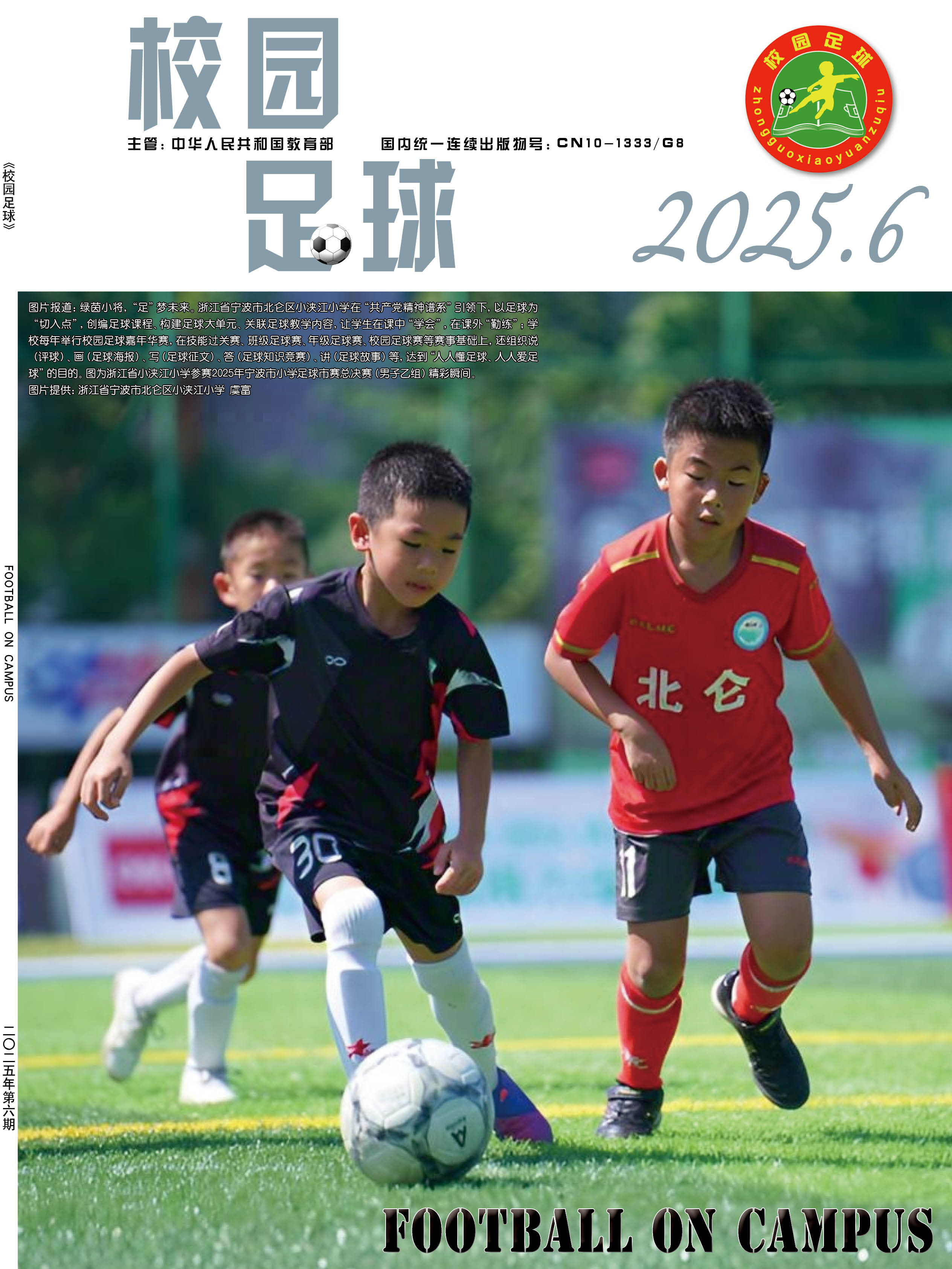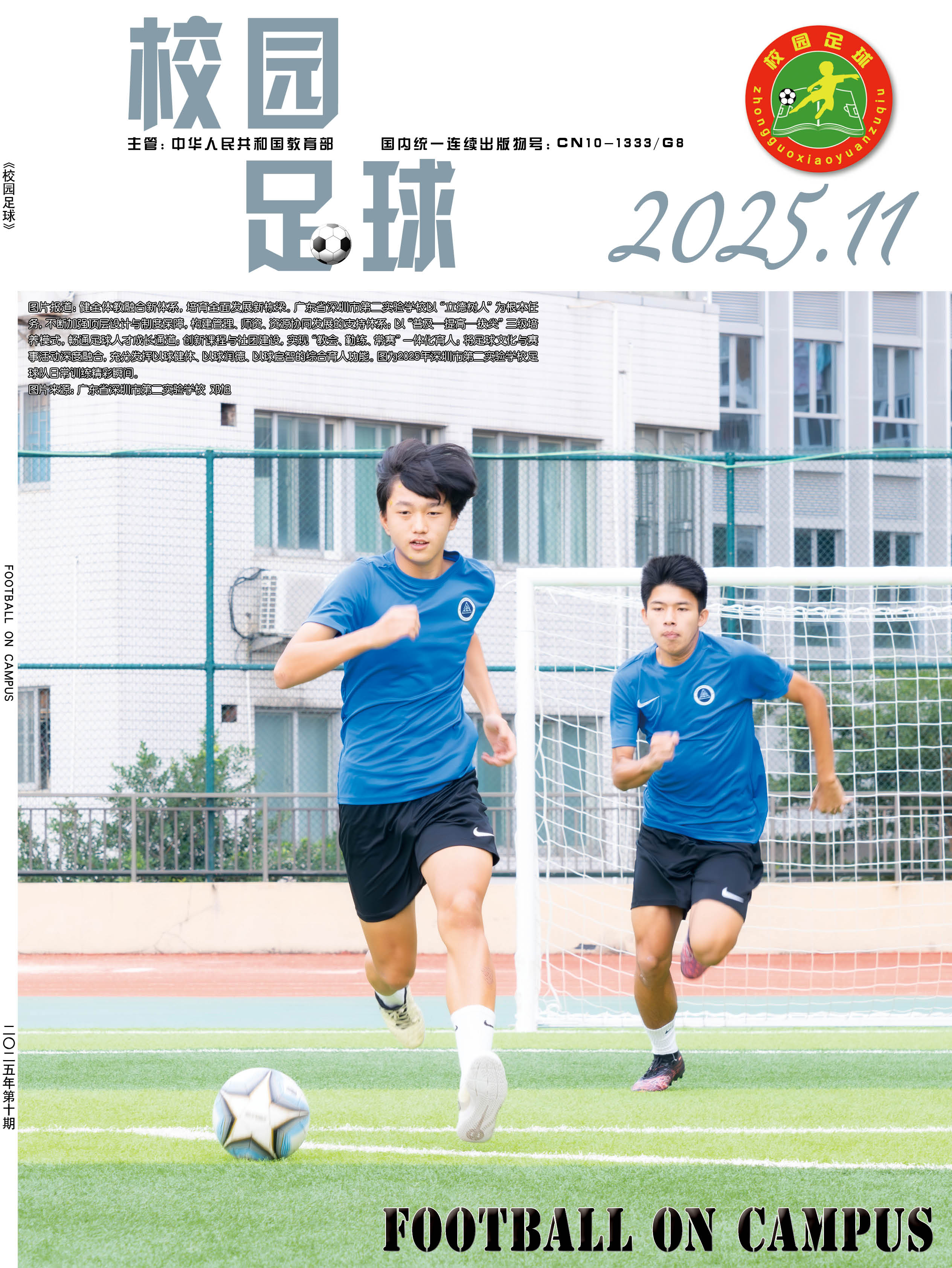 为了贯彻落实“全国学校体育工作座谈会”“全国青少年校园足球工作电视电话会议”等有关会议精神,提升青少年学生体质健康水平,夯实中国足球运动技能基础,正确引导学校、学生、家长和社会参与及支持校园足球工作,营造良好的社会舆论氛围,2015年,经教育部同意并报国家新闻出版广电总局批准,由中国中学生体育协会主办的国家级期刊《校园足球》(ISSN 2096-0352; CN 10-1333/G8) 正式出版。读者对象:校园足球行政管理人员、一线体育教师、体育教研员、广大青少年学生、校园足球特色学校等。